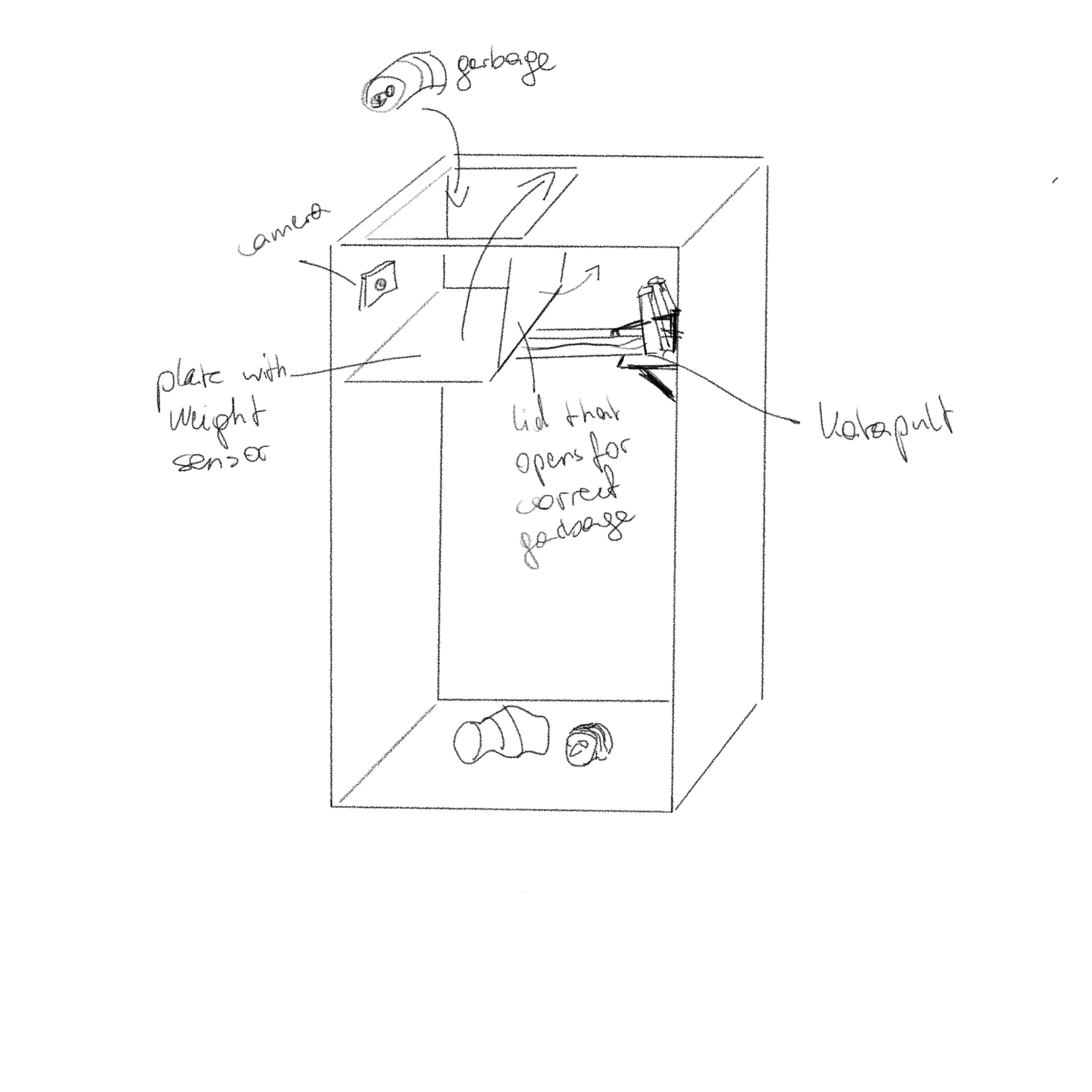 The idea for this project was to create a waste bin, that throws trash that does not belong into the bin, back outside. Furthermore, the bin insults the person with audio output. To throw the trash out, a catapult would be used. For the construction of the catapult, multiple references were found online. However, as it would not only have to catapult trash outside the bin, but also throw correct objects into the bin, these online references were used as a starting point. After sketching different versions of the catapult for the use case, the catapult in use was decided on. The detection of wrong garbage was a bit more unclear. Multiple options were considered. The simplest being a wizard of oz prototype, where a person would check whether the object belongs into the bin or not and press a button to generate the correct action. Another simplified idea was to assign a color to each garbage class and use a color sensor to classify the garbage. The most advanced idea was to use machine learning to classify the garbage thrown into the bin.