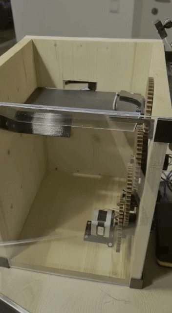 In the beginning, the plan was to use cardboard for the first prototypes. However, cardboard was not stable enough. Therefore, wood was used for the prototype’s basic framework. The mechanical parts were mostly printed with PETG 3D-print filament in order to have stable enough parts. All cable clips and mounts for the hardware were also 3D-printed. For the control of the motors and the basic logic, an Arduino UNO with motor shield was utilized. For the image recognition with camera and the output of the audio, a Raspberry Pi with a script of the programming language python was chosen. All in all the waste bin contained 1 stepper motor, 1 servo motor, 8 gears, 7 ball bearing, 1 spring, 1 Arduino, 1 motor shield, 1 Raspberry Pi, 1 camera, 1 speaker, 1 powerbank, 1 power supply (5V) and various small components containing about 750g 3D-print Filament and screws.